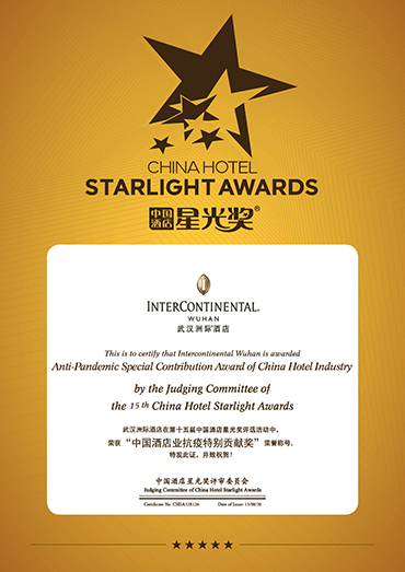 2020亞洲酒店及旅游論壇暨第十四屆中國酒店星光獎評選,于2020年8月12日-14日在上海舉行,武漢洲際酒店榮獲中國酒店星光獎――中國酒店業(yè)抗疫特別貢獻獎。